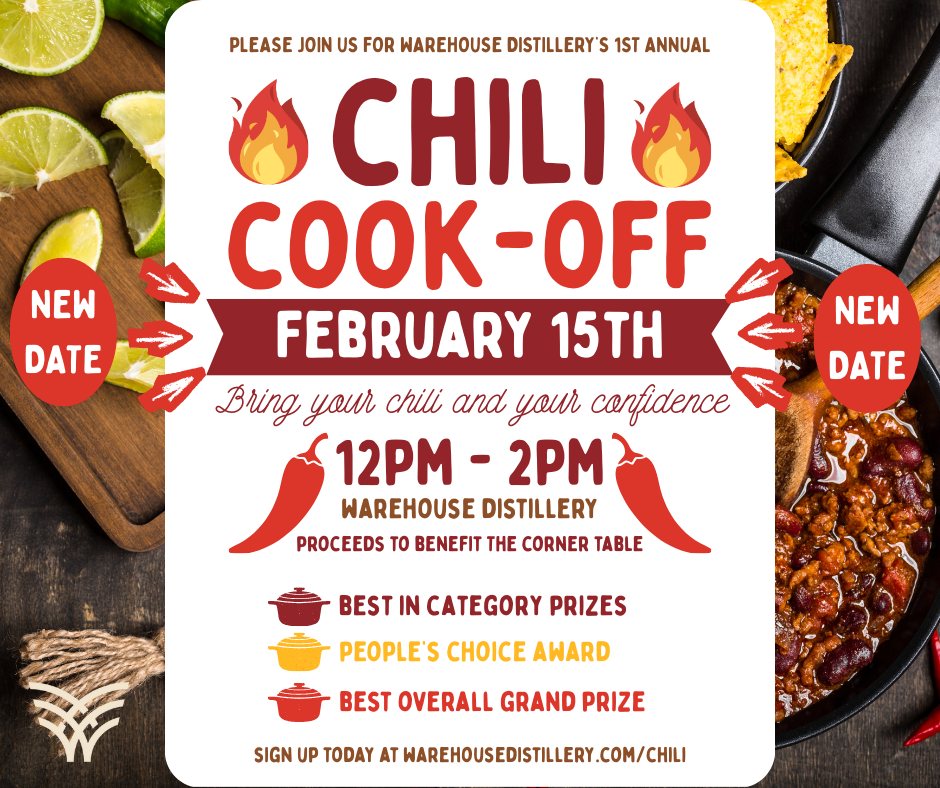 Feb 15 12:00 PM12:00 Chili Cookoff Sunday, February 15, 2026 12:00 PM 2:00 PM 12:00 14:00 Warehouse Disltillery (map) Google Calendar ICS Register To Participate View Event →